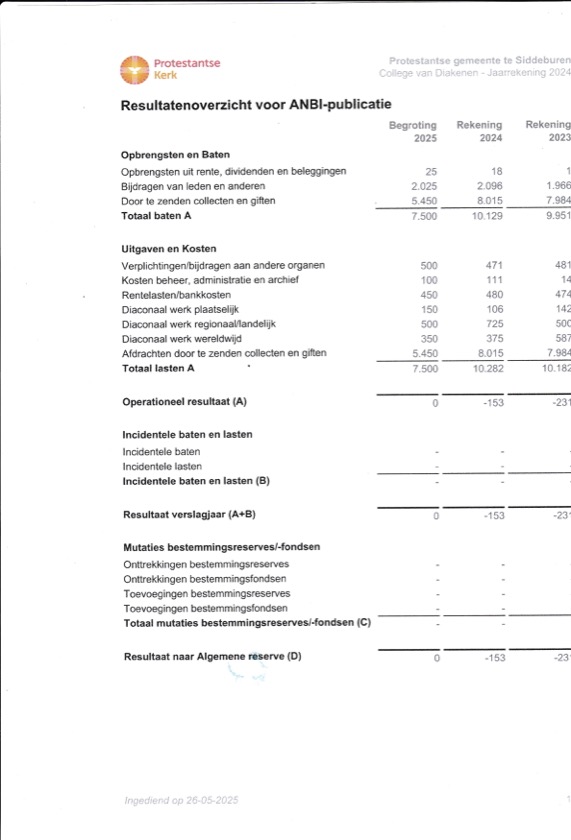 De Protestantse Kerk heeft van de Belastingdienst een groepsbeschikking ANBI gekregen. Dat wil zeggen dat de afzonderlijke gemeenten en andere instellingen die tot dit kerkgenootschap behoren zijn aangewezen als ANBI. Dit is ook van toepassing op de Diaconie van de Protestantse Gemeente Siddeburen.